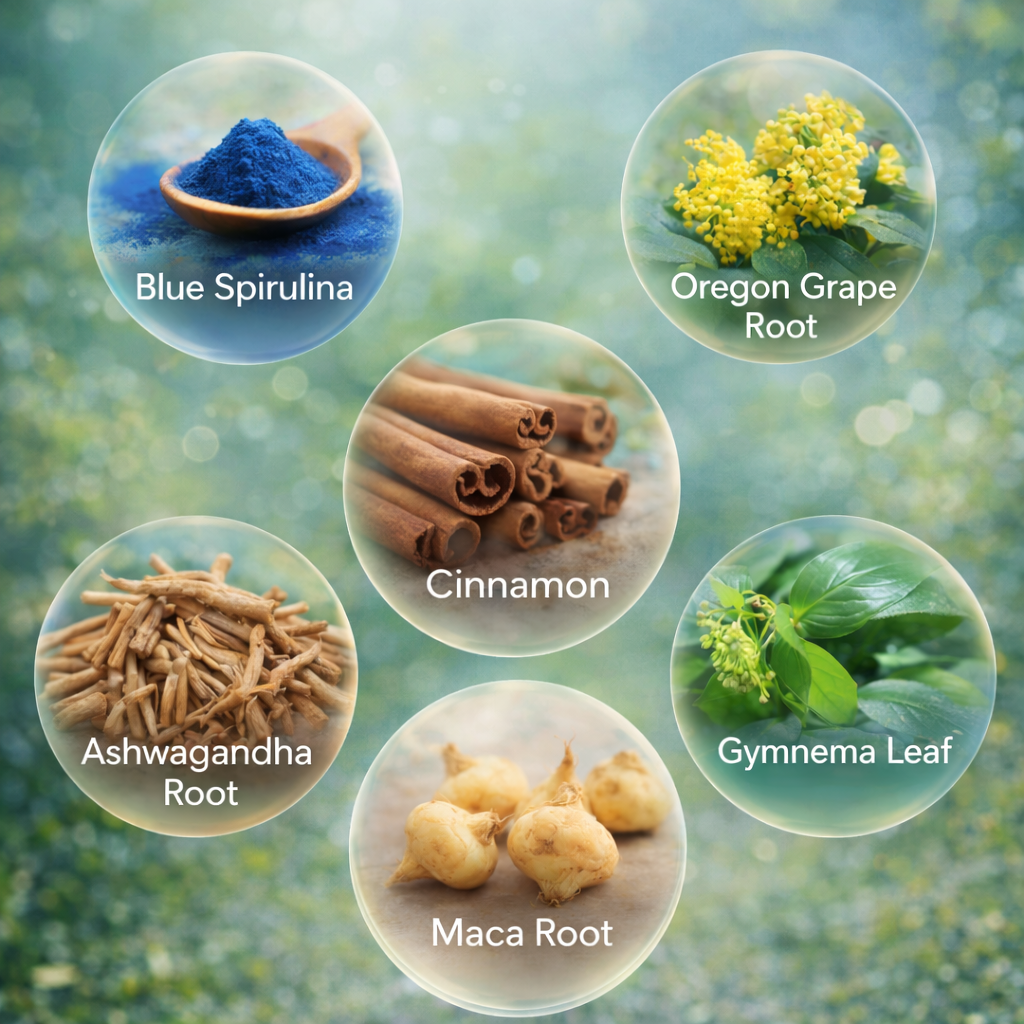 Berberine from Oregon grape root steadies blood sugar. Gymnema leaf kills sugar cravings. Ashwagandha stops stress from sending you to the fridge.